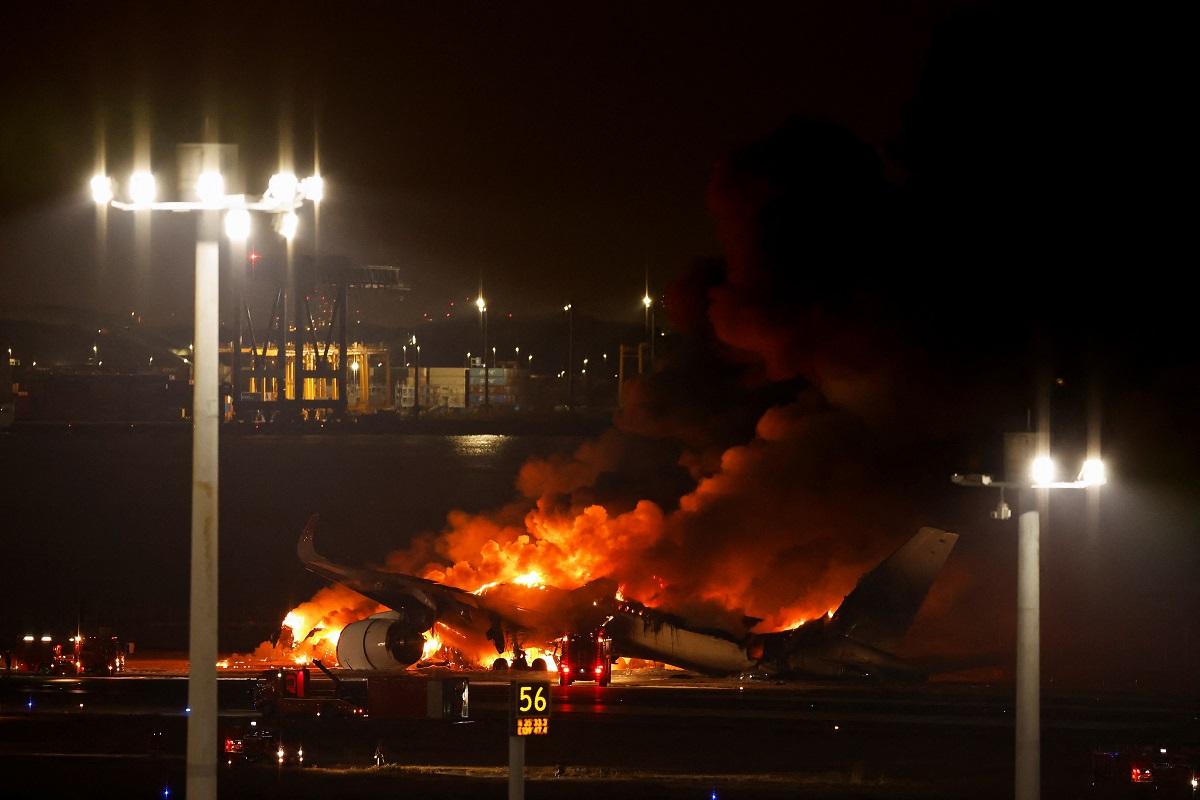 In a harrowing incident at Tokyo's Haneda Airport, a Japan Airlines plane carrying 379 passengers and crew narrowly escaped a catastrophic fire. The blaze erupted following a collision with a smaller Coast Guard aircraft. While all aboard the Japan Airlines Airbus A350 were evacuated safely, the fate of five Coast Guard crew members remains uncertain, with only the captain confirmed to have escaped.